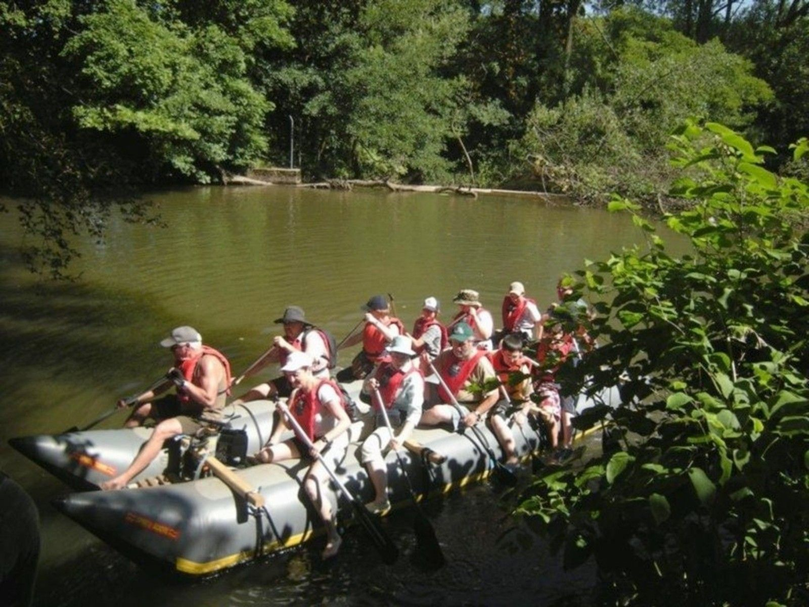 Auf der Blies im Schlauchboot mit Muskelkraft unterwegs. Und alle rudern zusammen - in die gleiche Richtung!